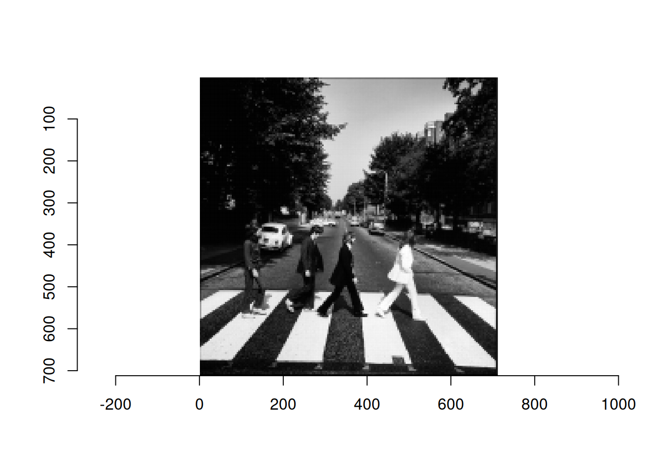 plot(as.cimg(exemple2_img), interpolate = FALSE )On encode donc l’image des Beattles avec ce système de patches.