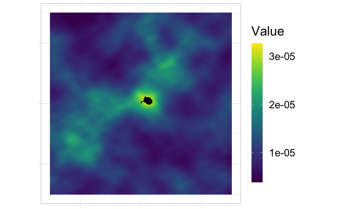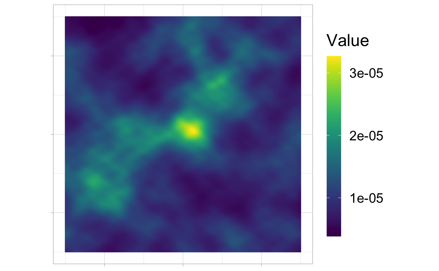 beta_true <- c(10, 5) ud_rast <- covariates[[1]] # initialization dx <- diff(ud_rast$x)[1] dy <- diff(ud_rast$x)[1] ud_rast$z <- exp(Reduce("+", lapply(1:J, function(j) dx * dy * beta_true[j] * covariates[[j]]$z))) ud_rast$z <- ud_rast$z / sum(ud_rast$z) ud_df <- rasterToDataFrame(ud_rast) ggplot(ud_df, aes(x,y)) + geom_raster(aes(fill = val)) + coord_equal() + scale_fill_viridis(name = "Value") + ggopts