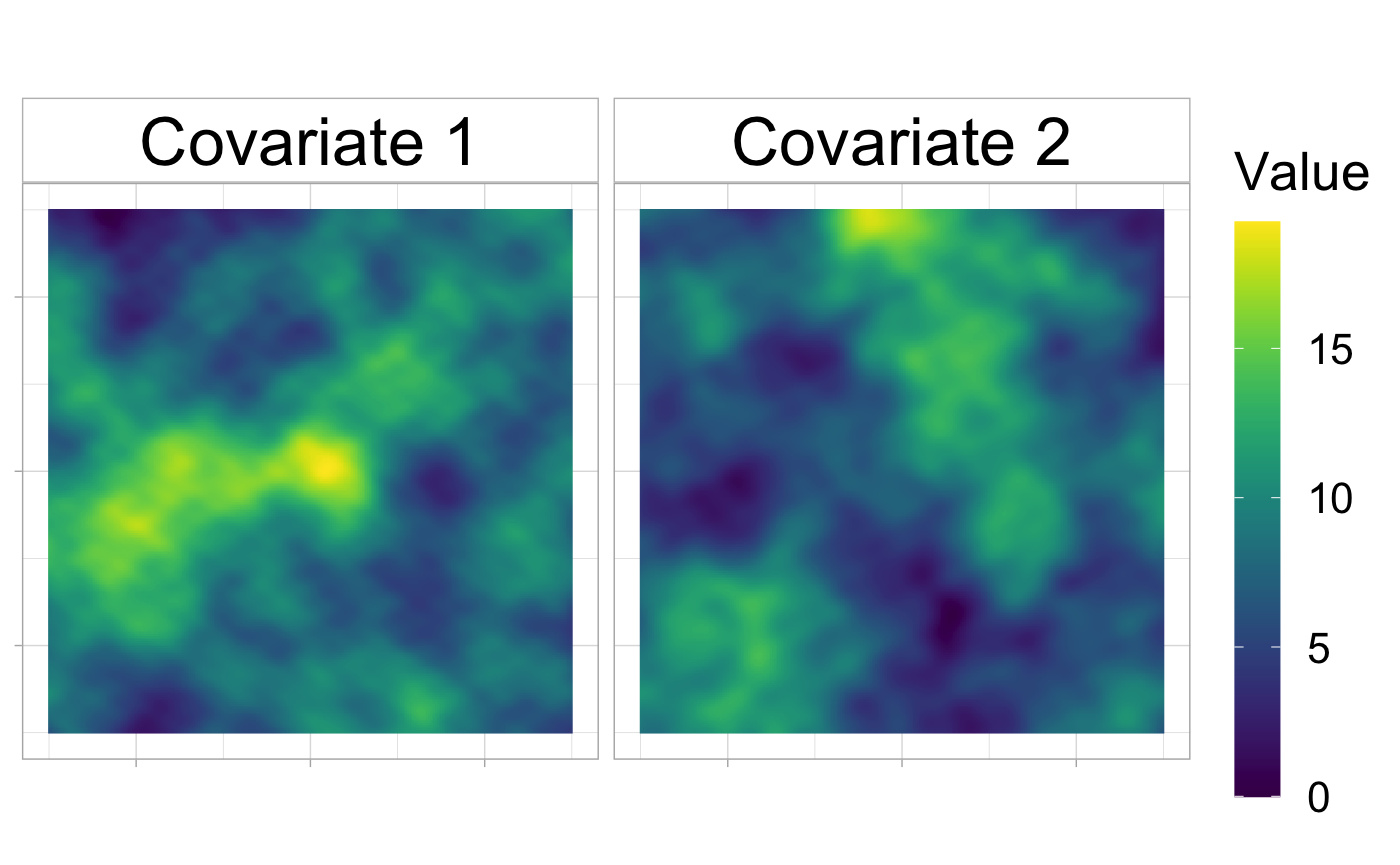 ggopts <- theme_light()+theme(text = element_text(size = 20), axis.text = element_blank(), axis.title = element_blank(), legend.key.height= unit(3, "line"), strip.background = element_rect(fill="white",colour = "grey") , strip.text = element_text(size = 25, color = "black")) levels <- factor(paste("Covariate", 1:J), levels = paste("Covariate", 1:J)) cov_df <- do.call(rbind.data.frame, lapply(1:J, function(j){ Rhabit::rasterToDataFrame(covariates[[j]], levels[j]) })) ggplot(cov_df, aes(x,y)) + geom_raster(aes(fill = val)) + coord_equal() + scale_fill_viridis(name = "Value") + facet_wrap(level~.) + ggopts