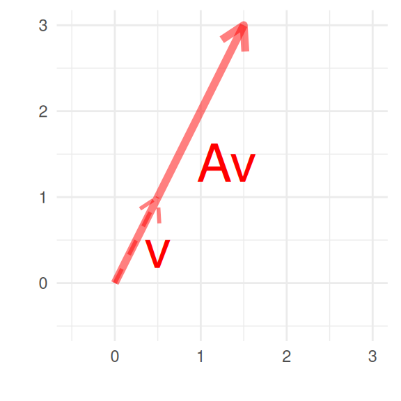Consider a square matrix, \(A \in \R^{d\times d}\), and a nonzero vector, \(v \in \R^d\), \(v\) is an eigen vector for the eigen value\(\lambda\) if \[Av = \lambda v.\] If \(v\) is an eigen vector for \(A\), applying \(A\) to \(v\) just consists in multiplying by the corresponding eigen value.